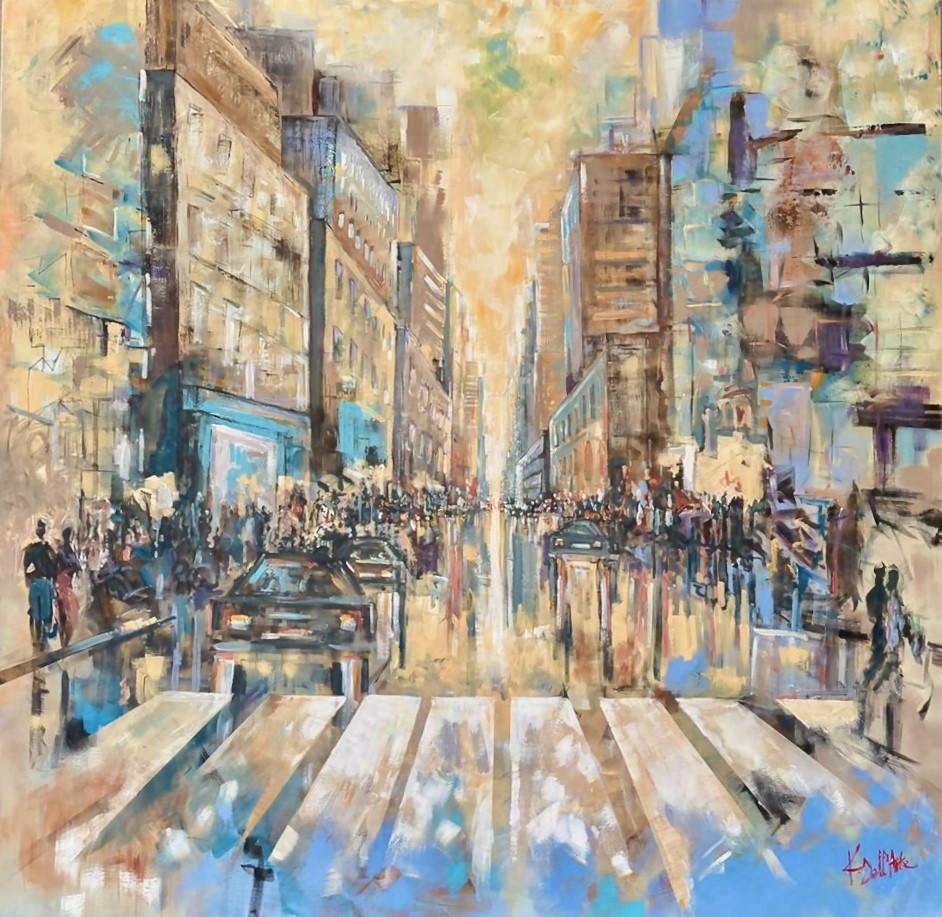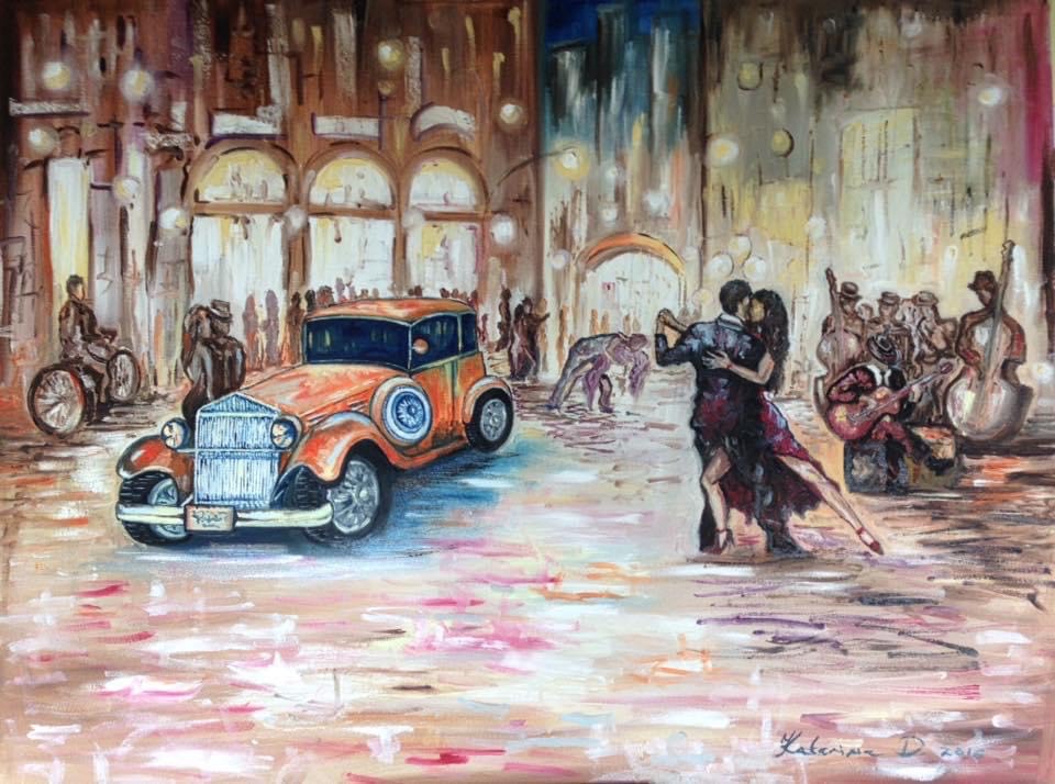 Beneath the city lights’ shimmering embrace, their bodies intertwined in a tango’s passionate rhythm, the bustling street transformed into a stage for their unspoken desires. With every step, the music whispered secrets only the night could hold, painting their love story in elegant movements beneath the starlit sky. The painting reflects feelings and memories of my life in Spain.