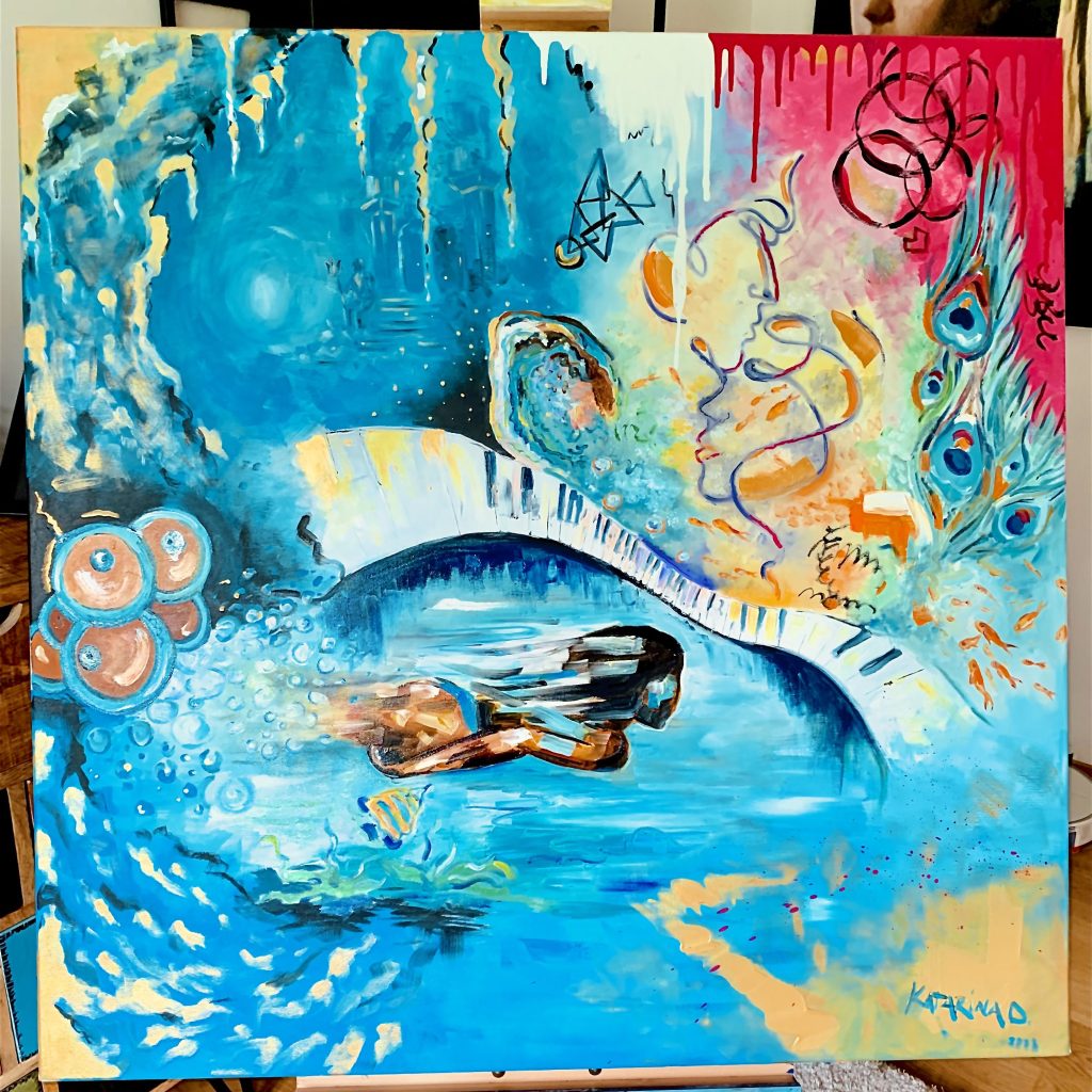 In this evocative painting, an expanse of swirling colors forms a sea of memories, each wave carrying fragments of moments long past. Beneath the surface, a hidden realm emerges—an intricate undersea reef, adorned with vibrant corals and teeming with life. This deep, guarded kingdom unveils its secrets to those who dare to explore its depths, where ancient mysteries are locked away, waiting to be unraveled by intrepid souls willing to dive into the currents of time.