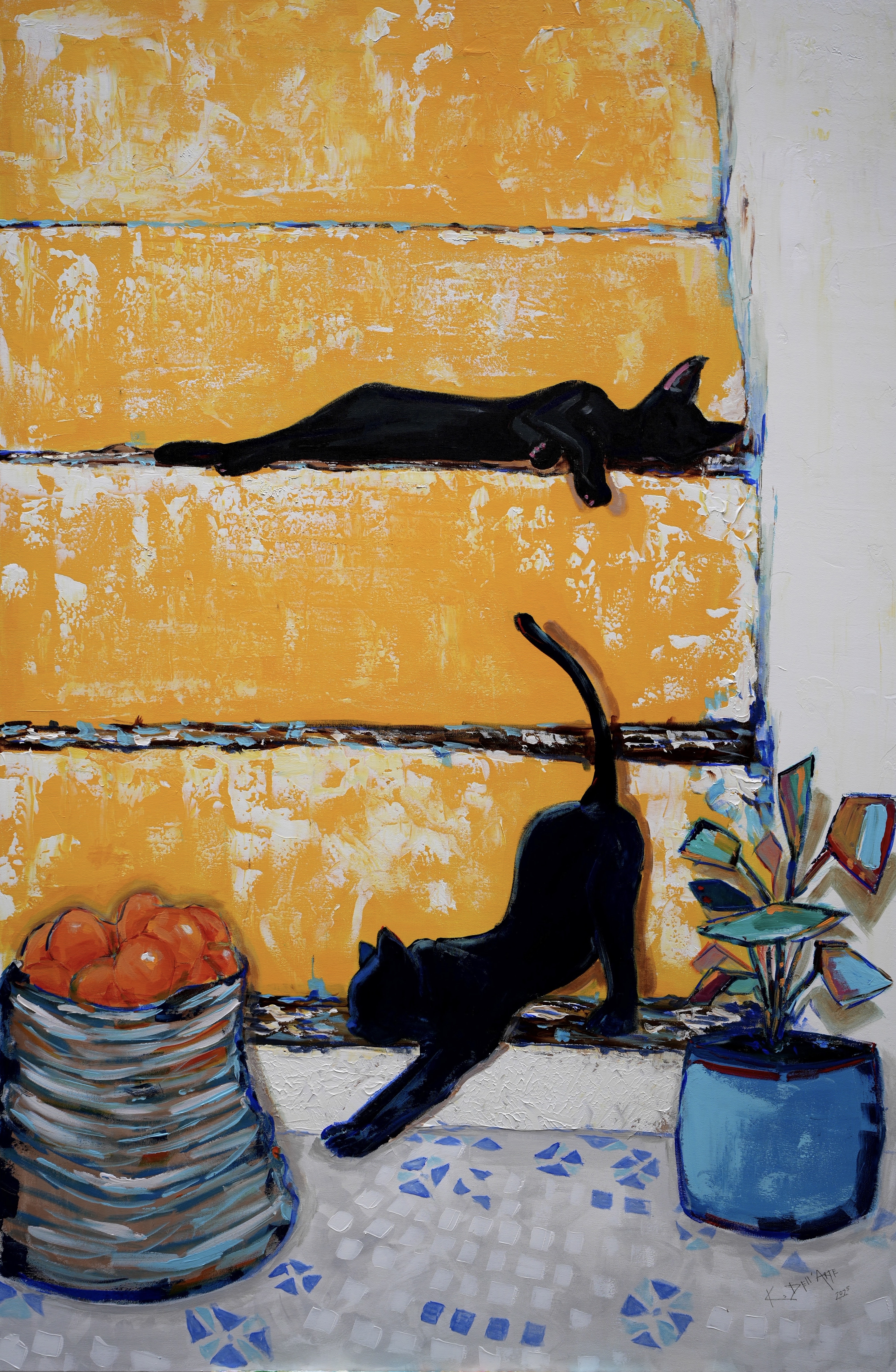 Pod objemom mestnih luči so se njuna telesa prepletala v strastnem ritmu tanga, živahna ulica pa se je spremenila v oder njunih neizrečenih želja. Z vsakim korakom je glasba šepetala skrivnosti, ki jih lahko sprejme le noč, in slikala njuno ljubezensko zgodbo v elegantnih gibih pod zvezdnim nebom. Slika prikazuje kolaž čustev in spominov na življenje v Španiji.